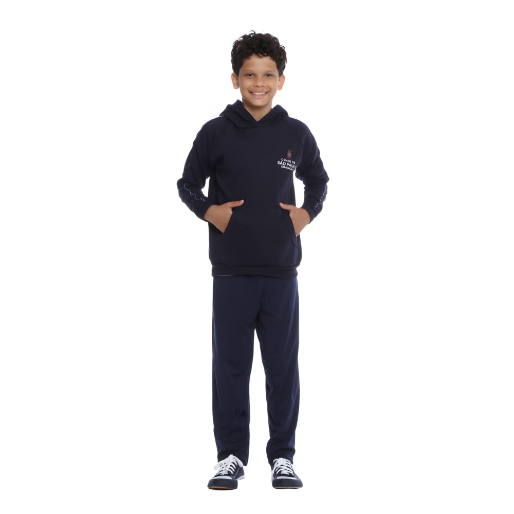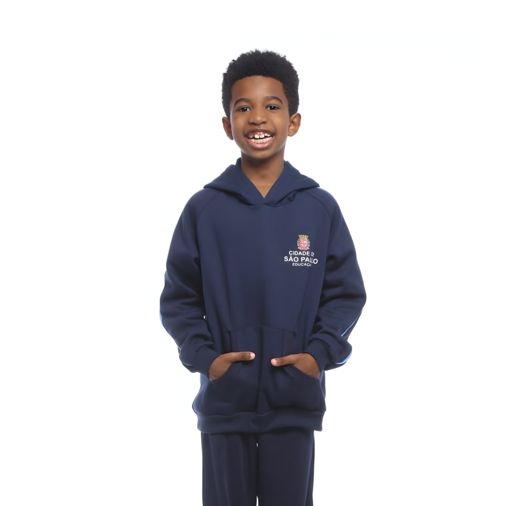 A Blusa escolar é confeccionada em tecido moletom 50% Algodão % poliéster que atribui conforto, durabilidade e modelagem regular fit para liberdade nos movimentos, possui capuz e bolso canguru, com tecido sanfonado na barra, punho e bolso.